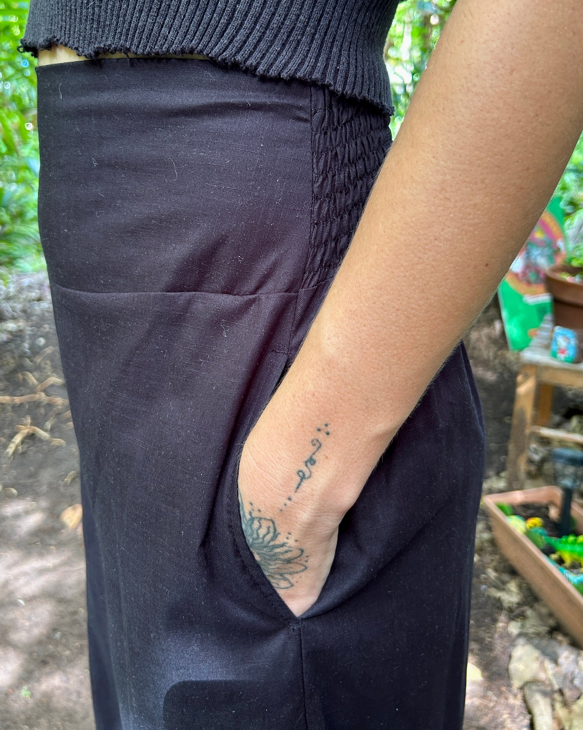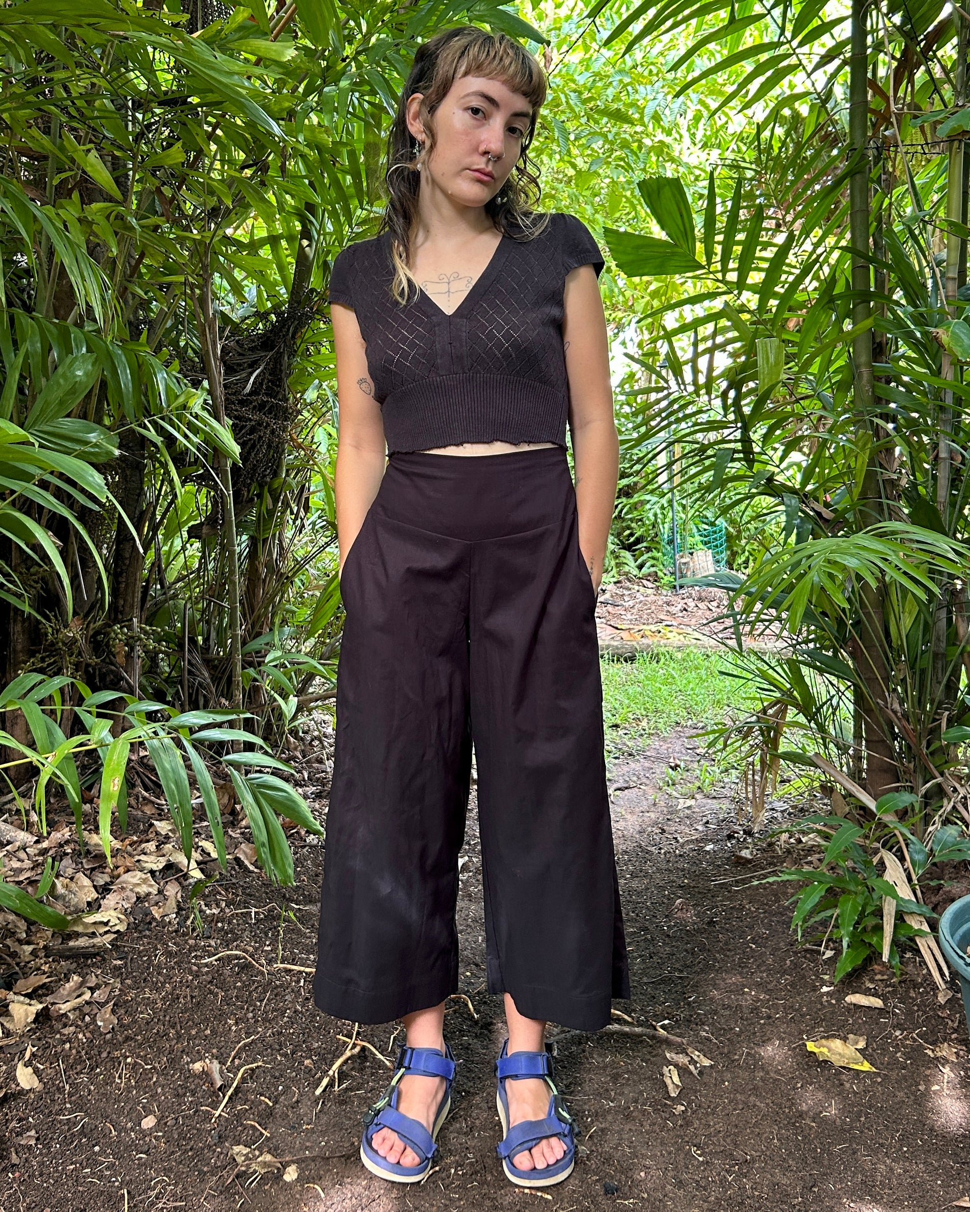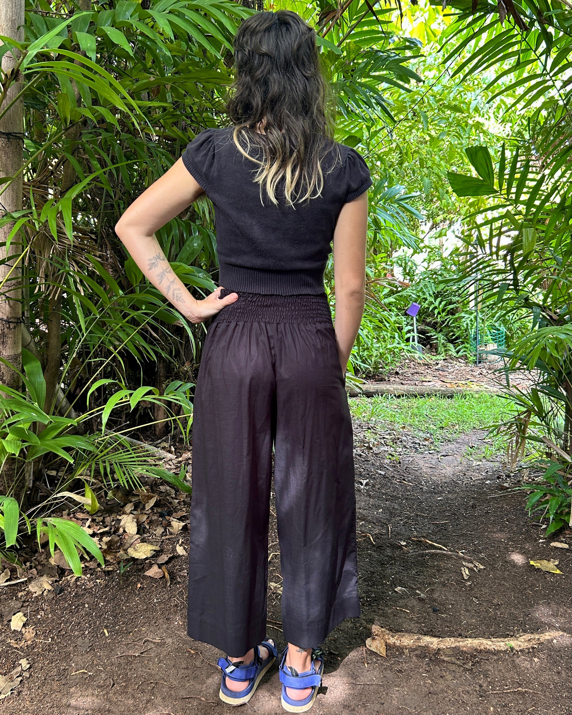 Super comfy cotton slub wide-leg pants, with pockets! Featuring ruching at the back waist and a V-shaped panel on the front waistband.