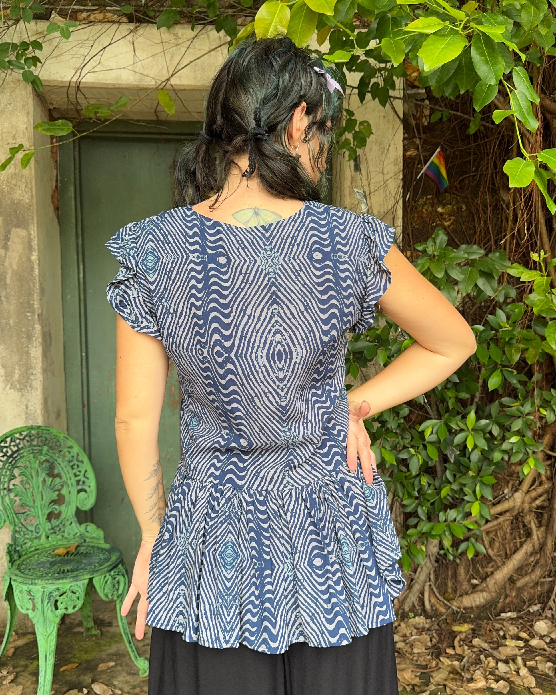 Our NEW V-neck Ruffle Top in Blue Geo!