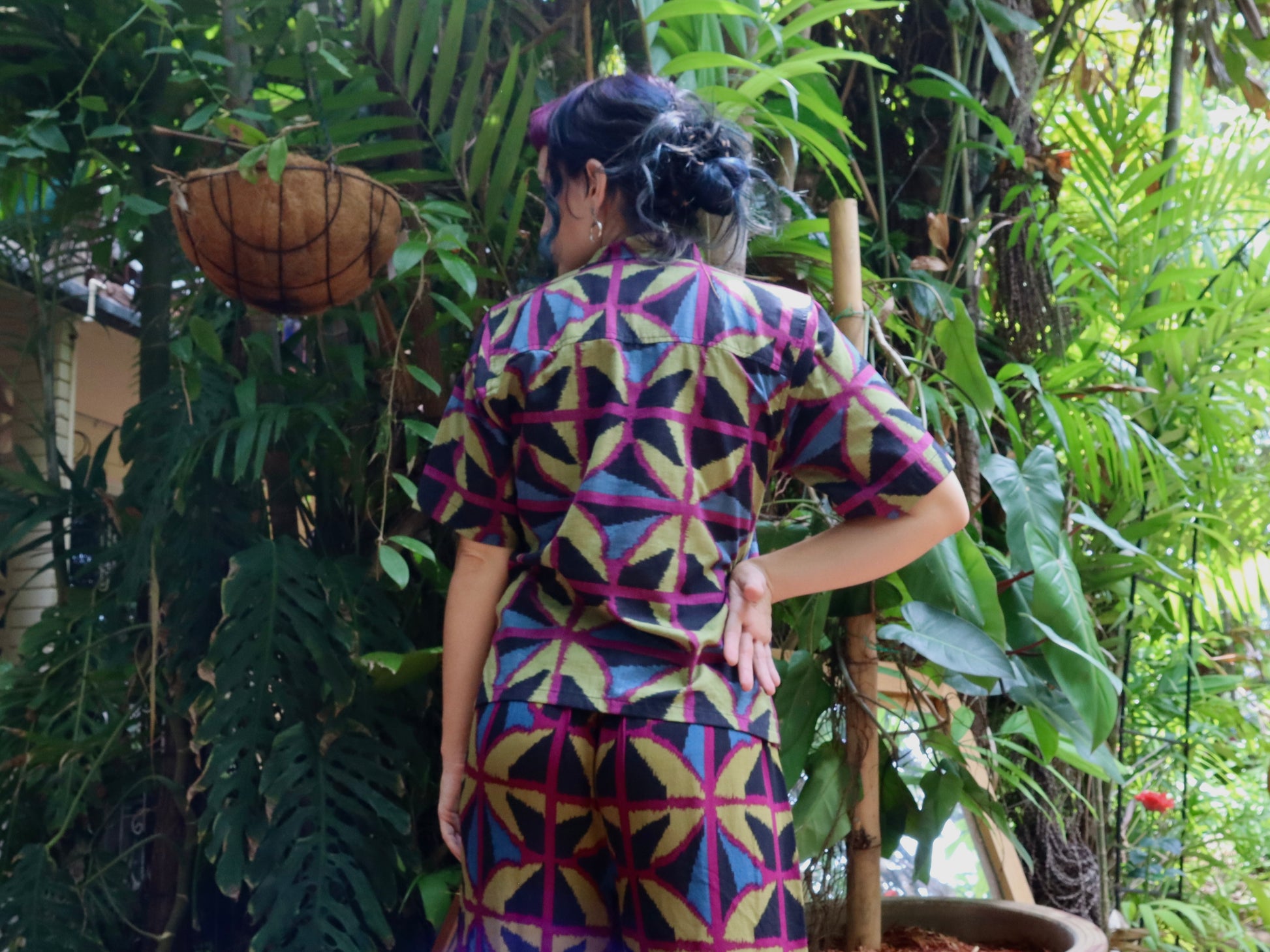 Our button up Gold Rush shirts sport a Mandarin collar and generous short sleeves, bust darts, slightly tailored shape, side splits; they pair beautifully with our matching shorts, pants and skirts!