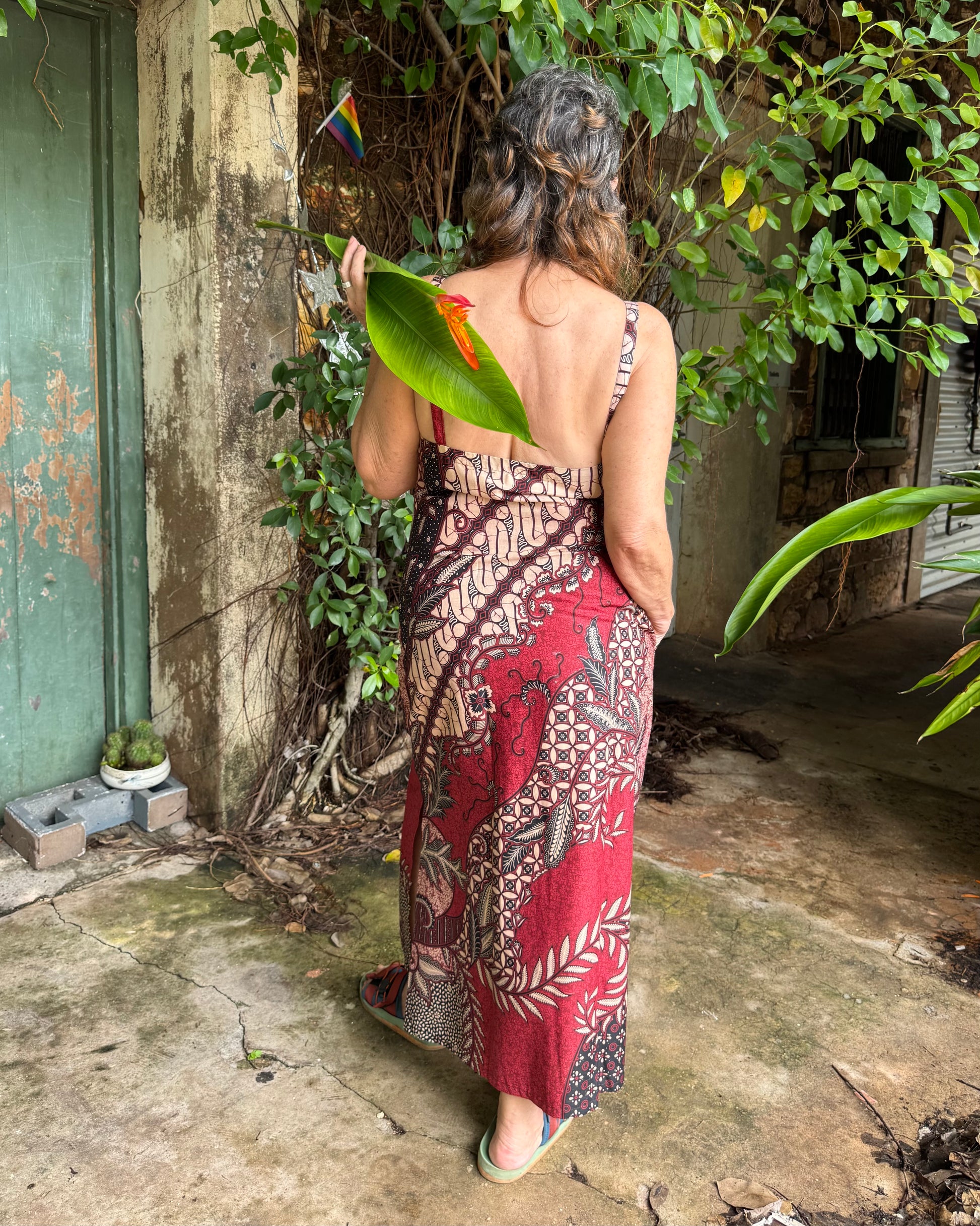 Features a gorgeous red swirl Batik print,