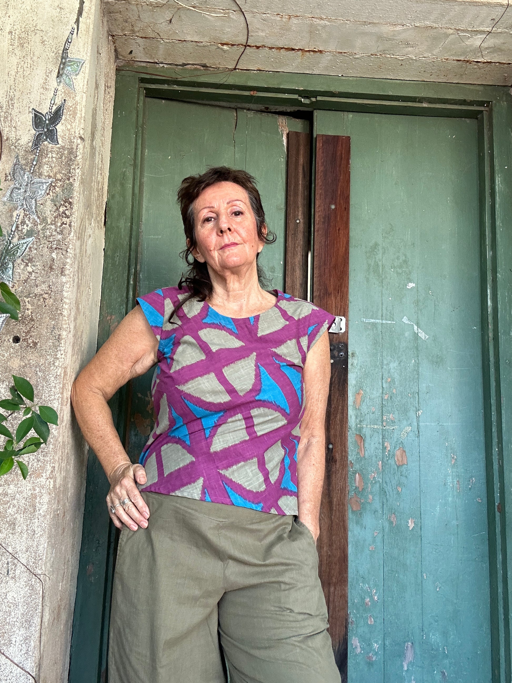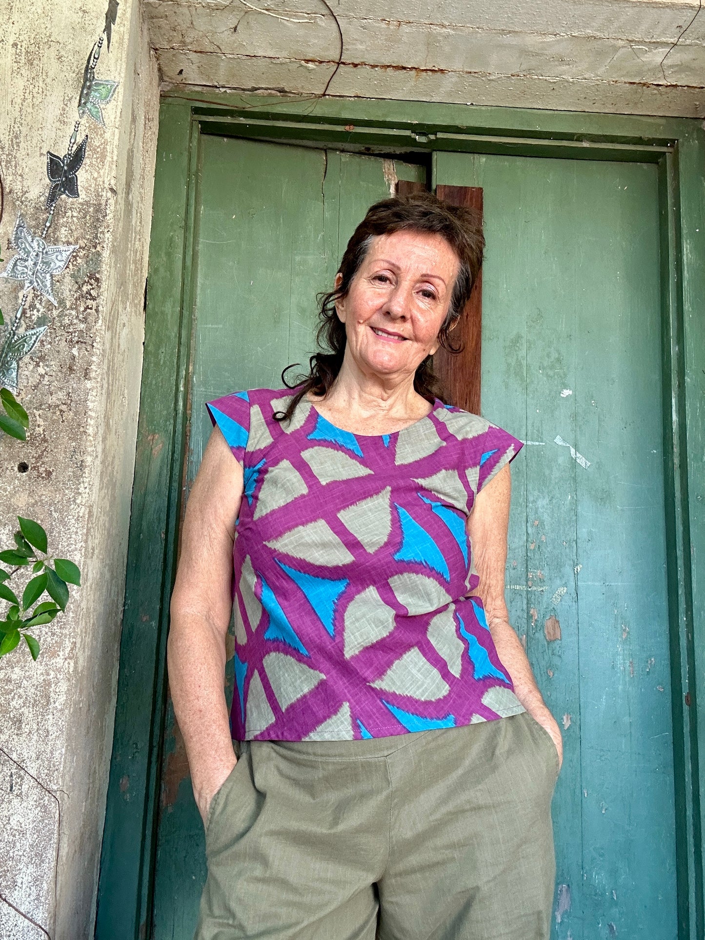 Cut on the bias, with cap sleeves, round neckline and a curved hem. The model is a size 10/12 and wears size M for a snug fit.. Made by a small-scale family business in Indonesia.