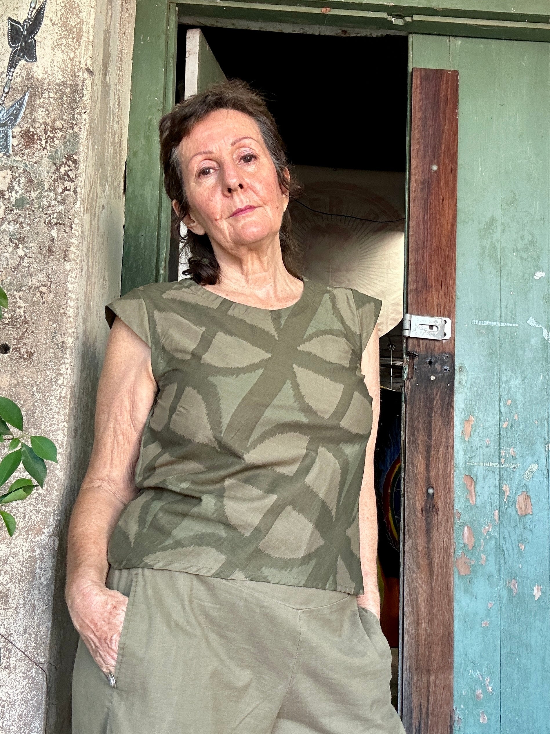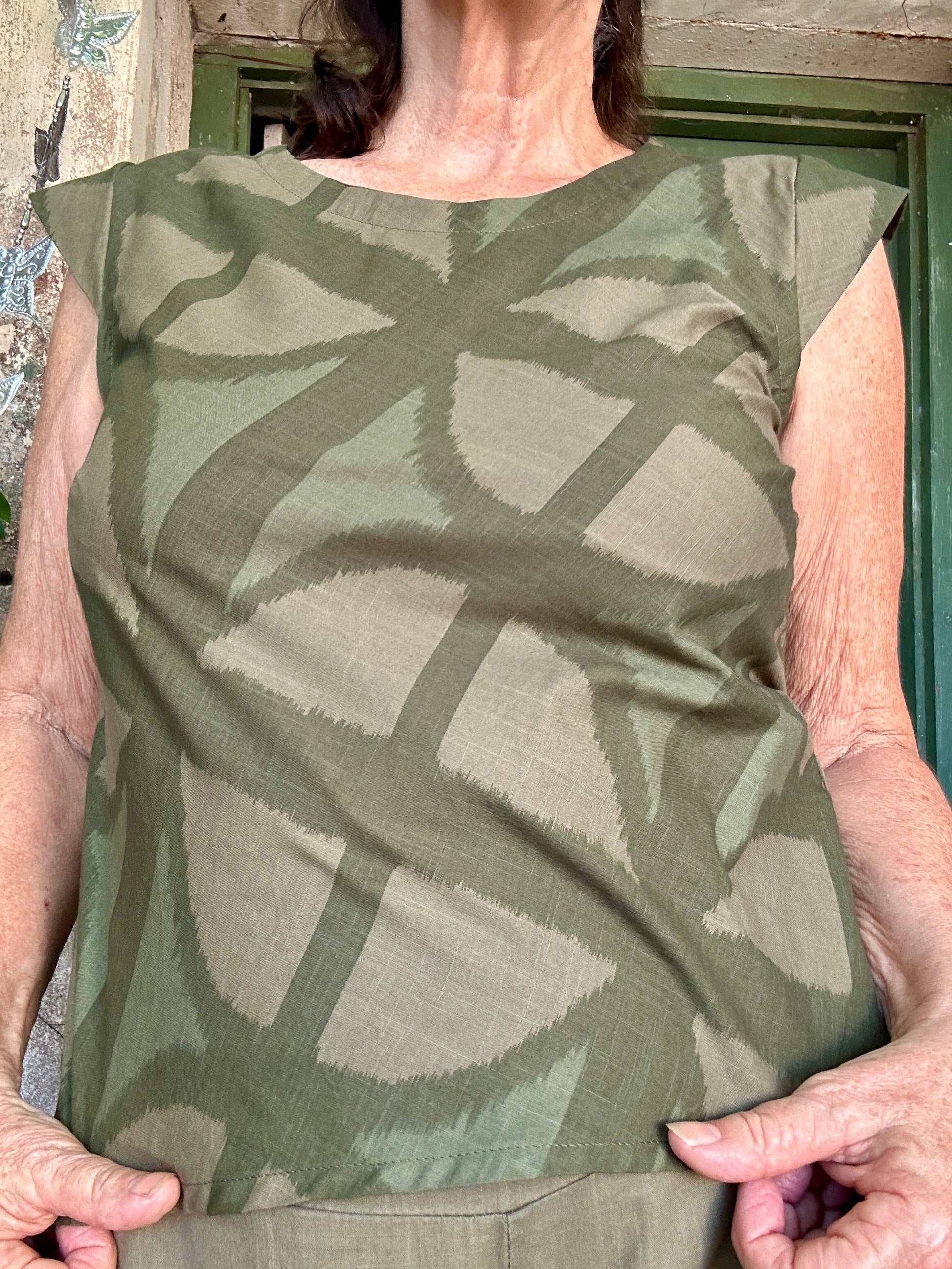 Cut on the bias, with cap sleeves, round neckline and a curved hem. The model is a size 10/12 and wears size M for a snug fit.. Made by a small-scale family business in Indonesia.