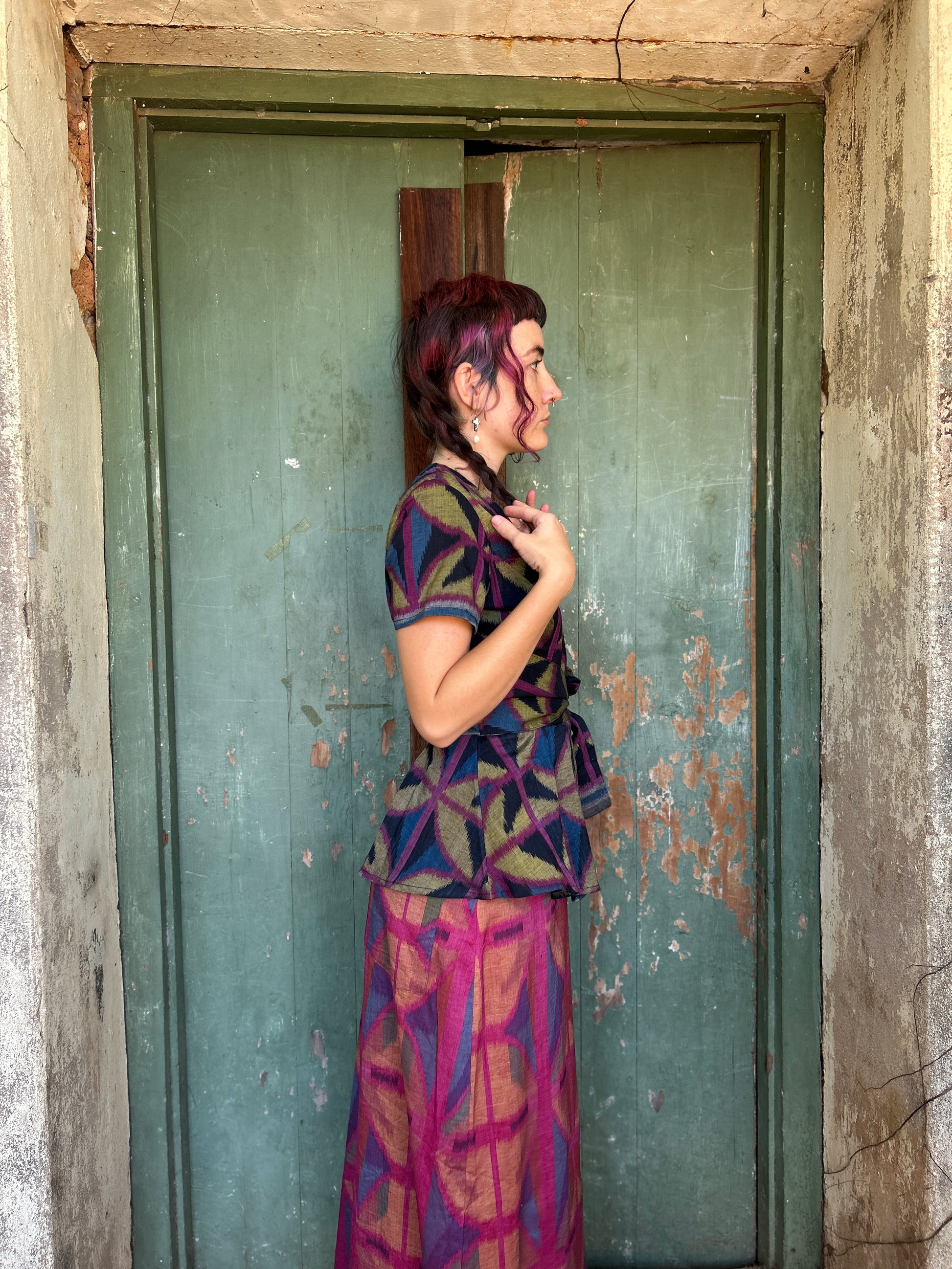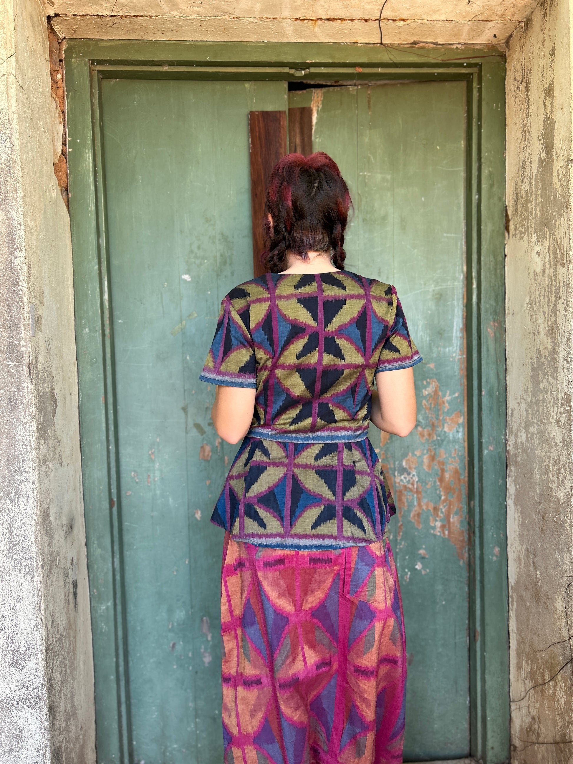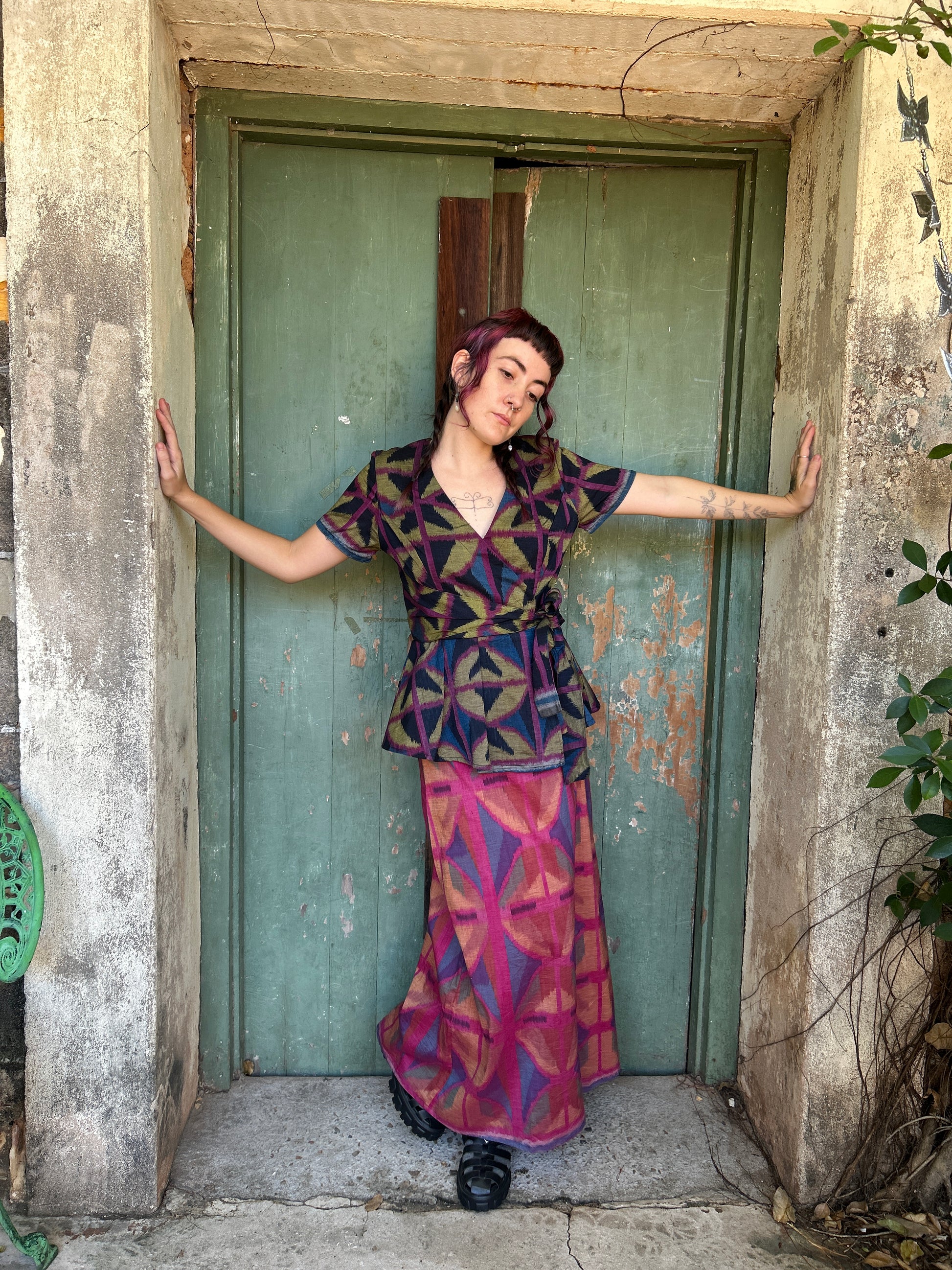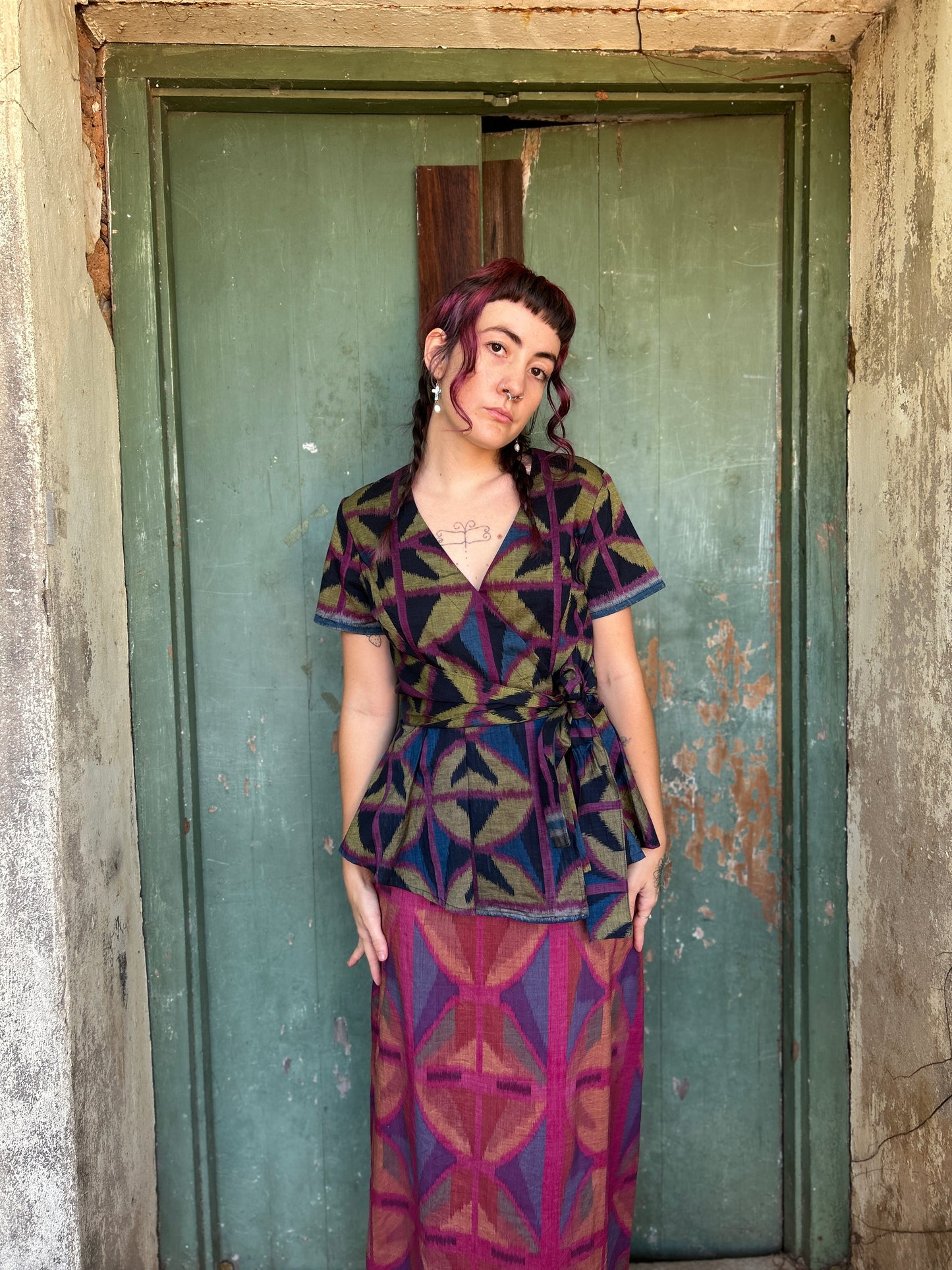 Ikat Long Wrap Top in 4 colour Breezeblock motif