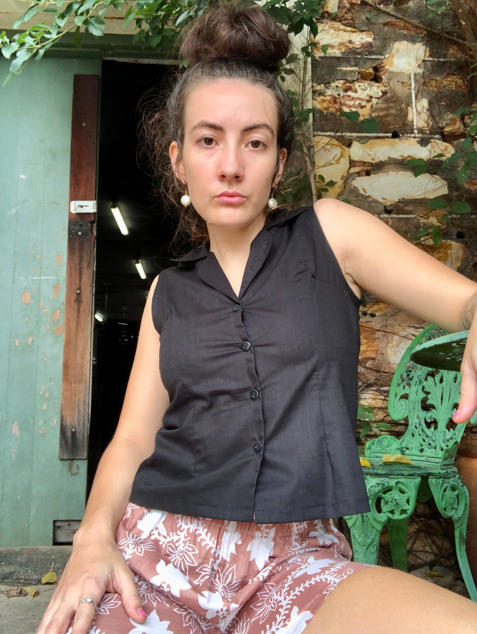 Easy wear light cotton, featuring button up sleeveless top with rounded collar, and darts front and back for a semi-fitted look.