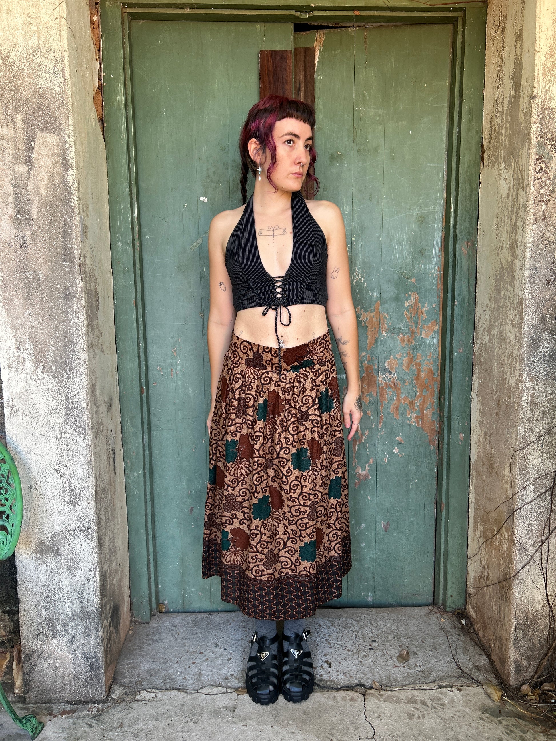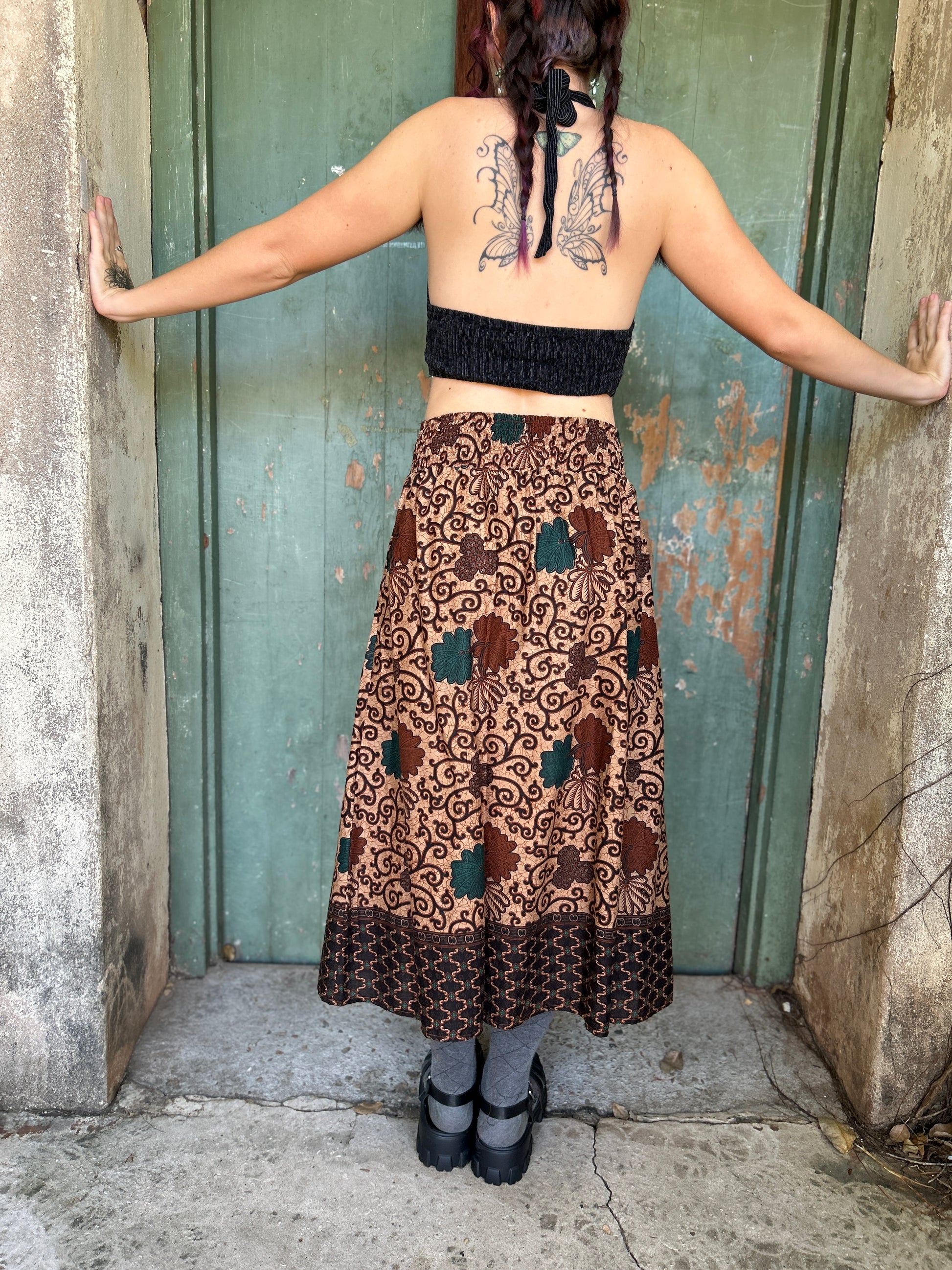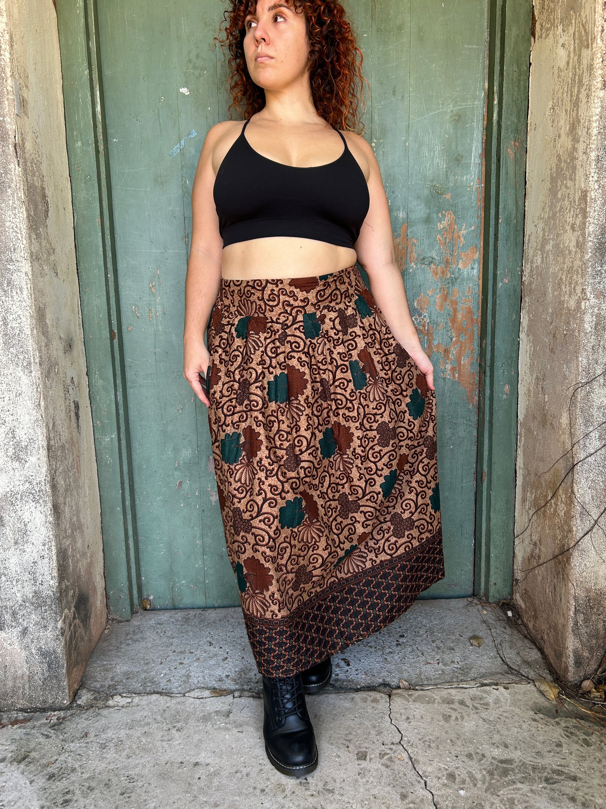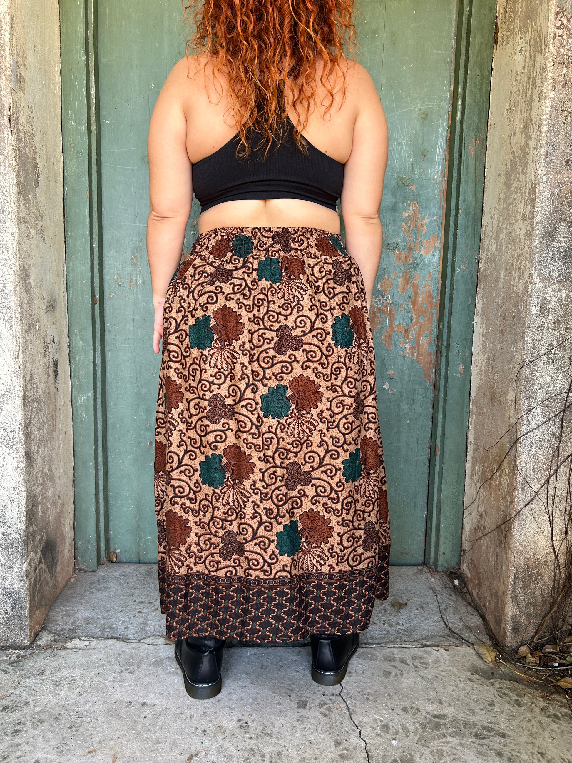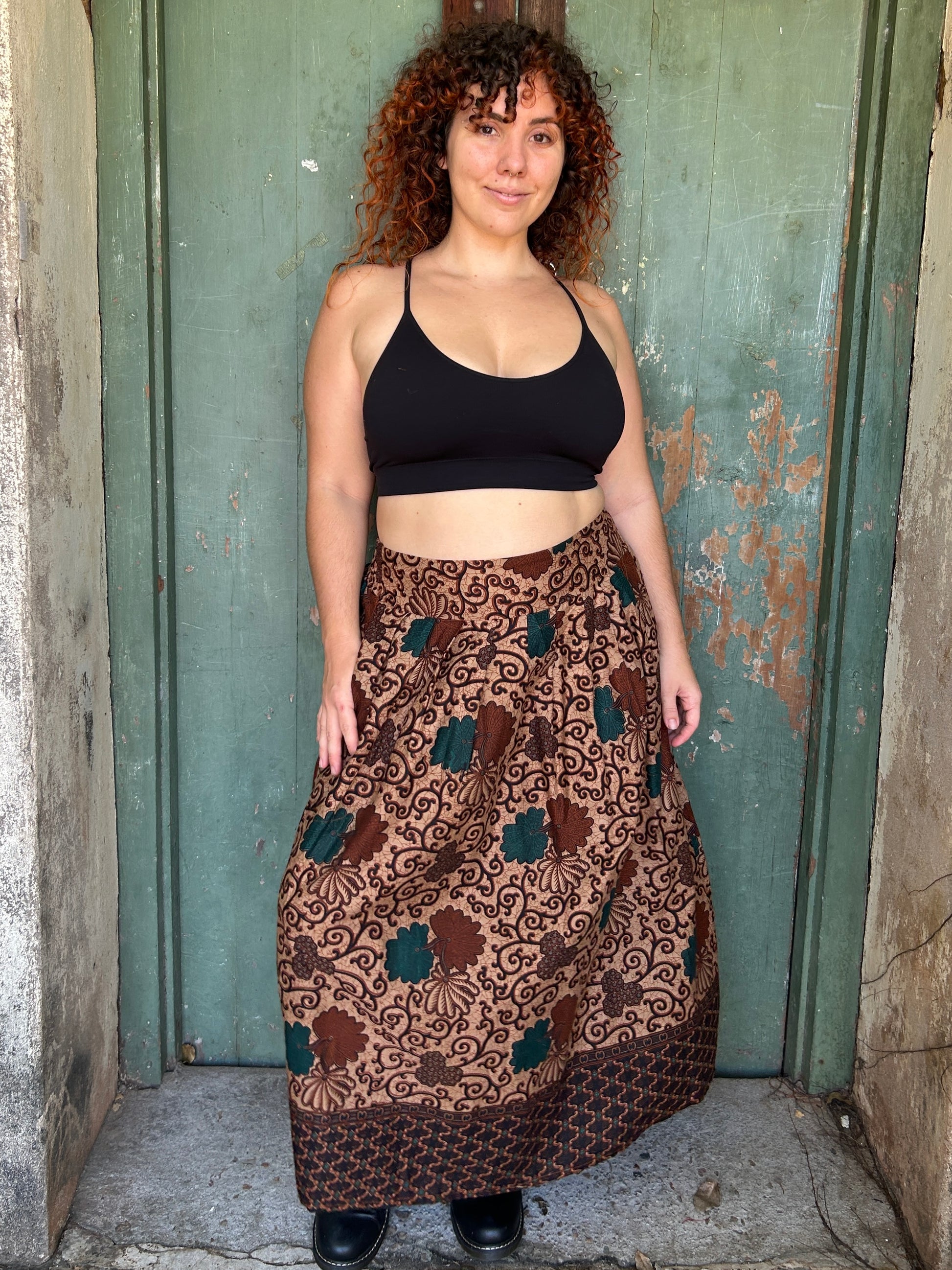 Designed for comfort, featuring front pleats below the front waistband , ruching at the back waistband, made with Cotton Batik print. Generous deep inset side pockets. Generous sizing, our 16 fits a size 18 easily because of the elasticised back.