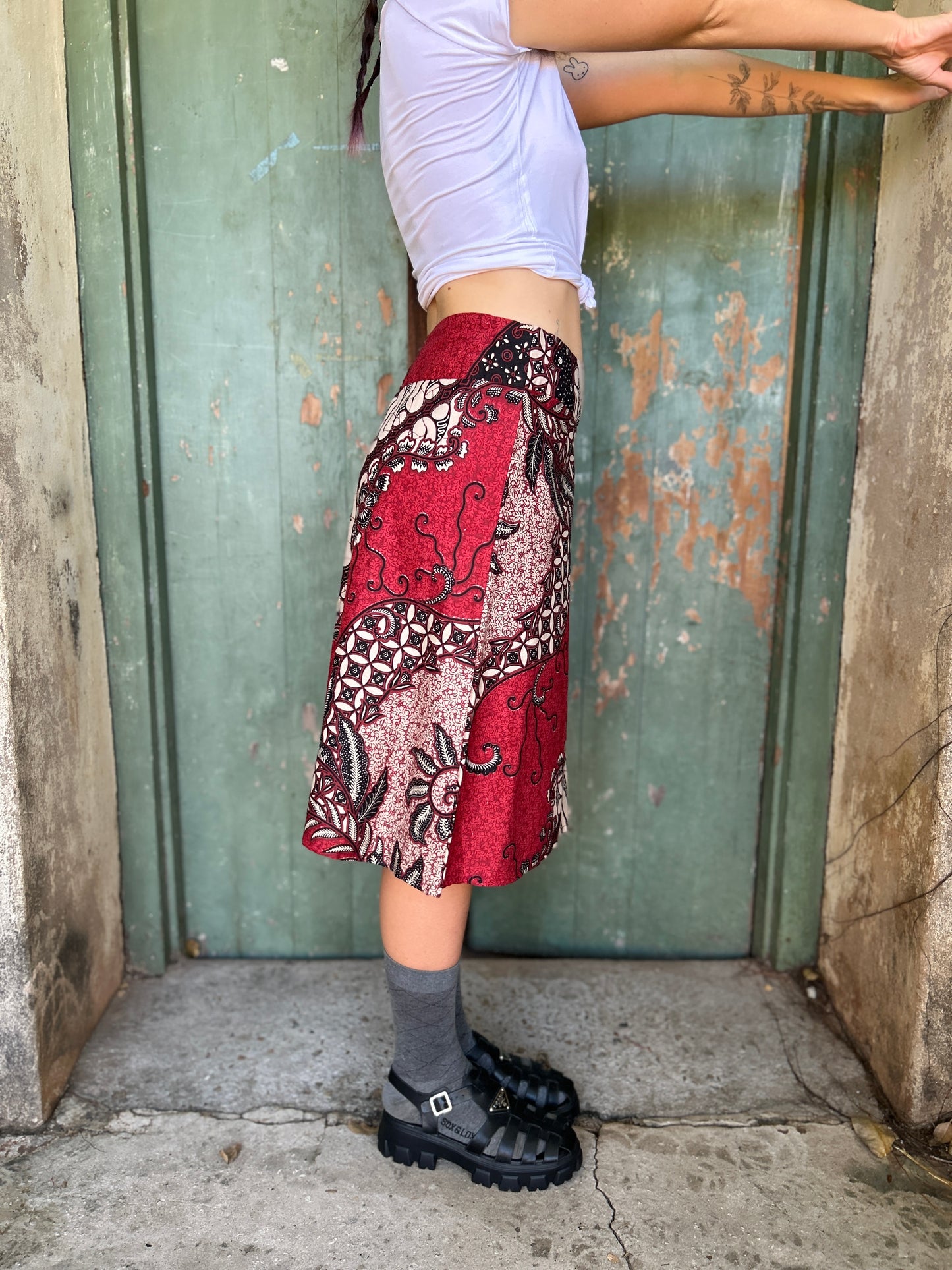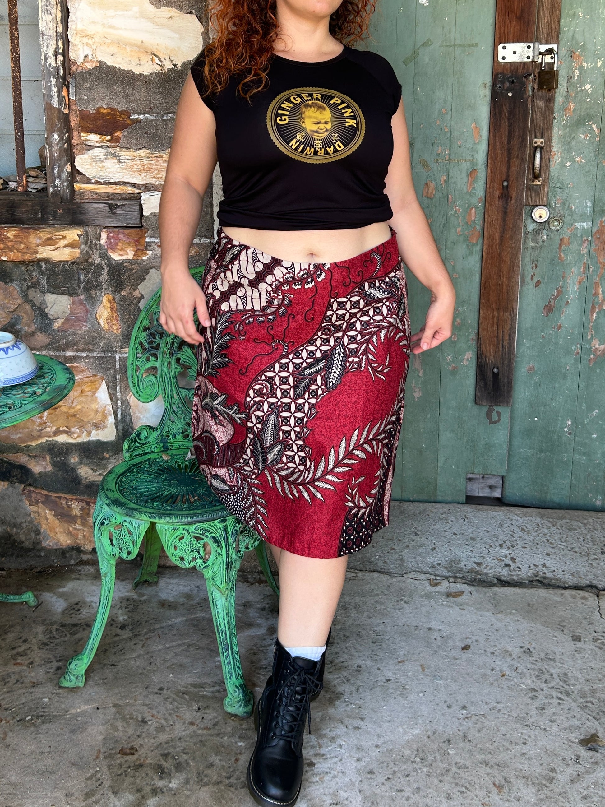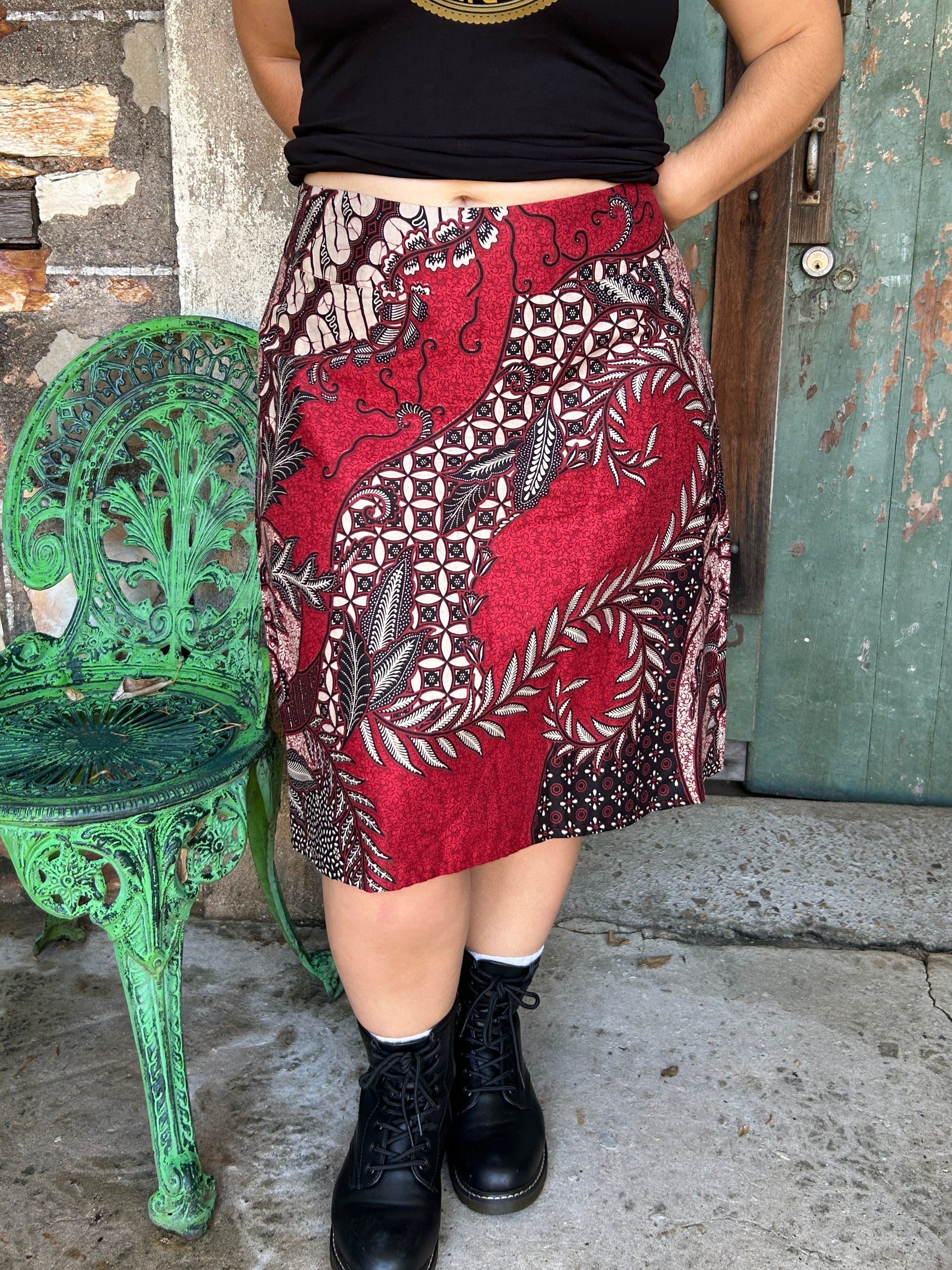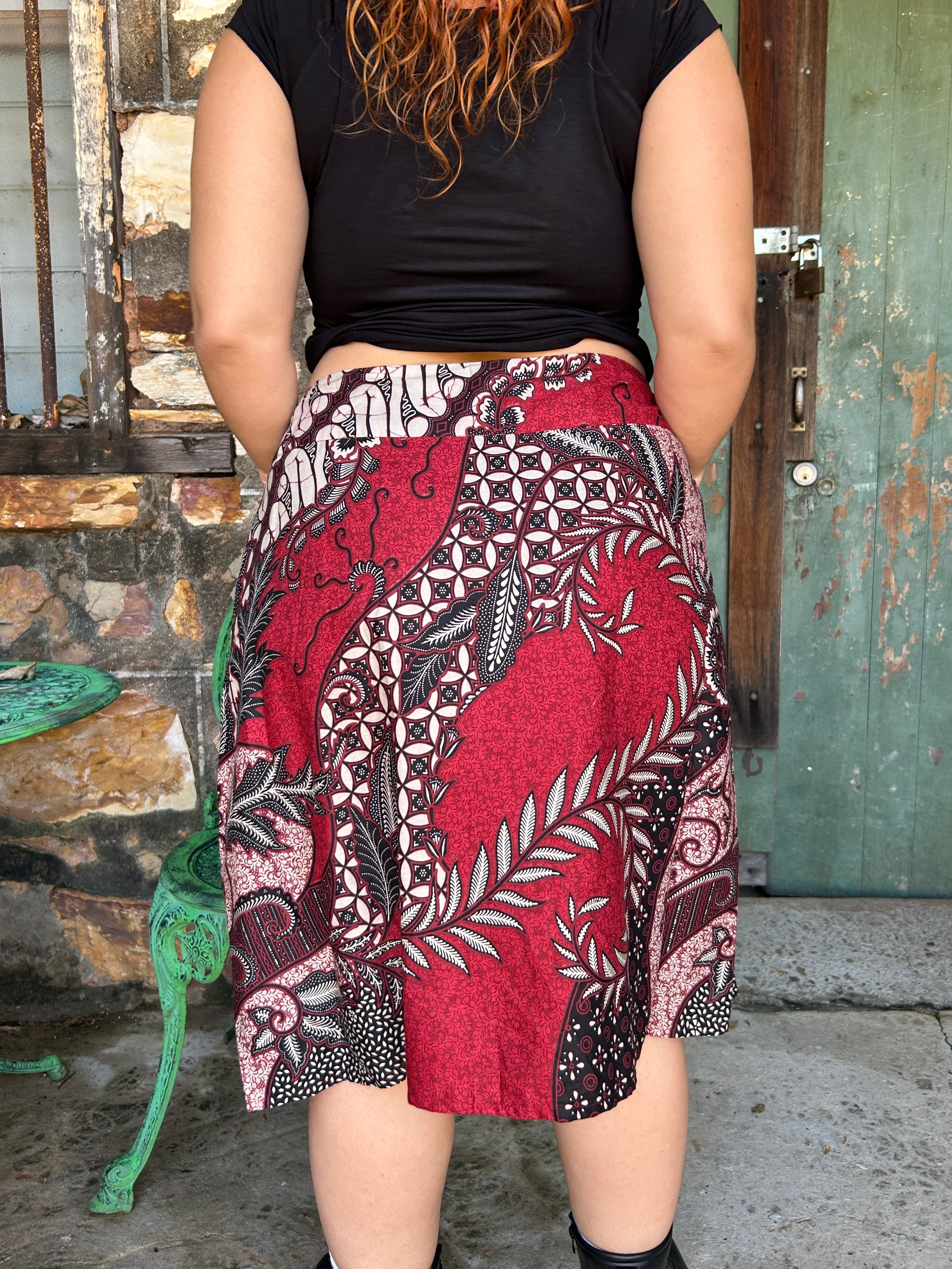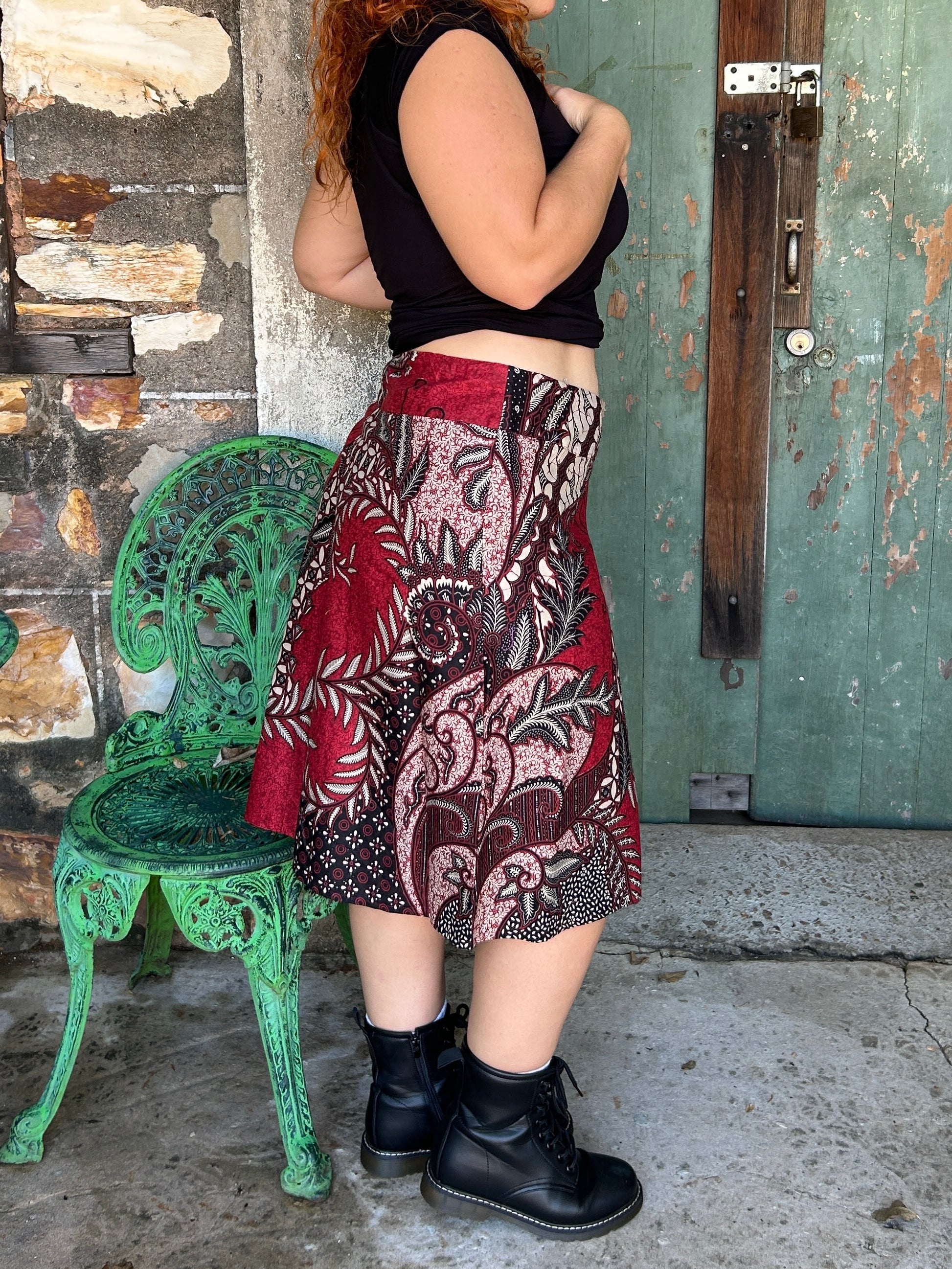 Designed for comfort, falls just below the knee, side zip, made with 100% Cotton Sarong Batik Print material . Can be worn at the waist or below the belly button.