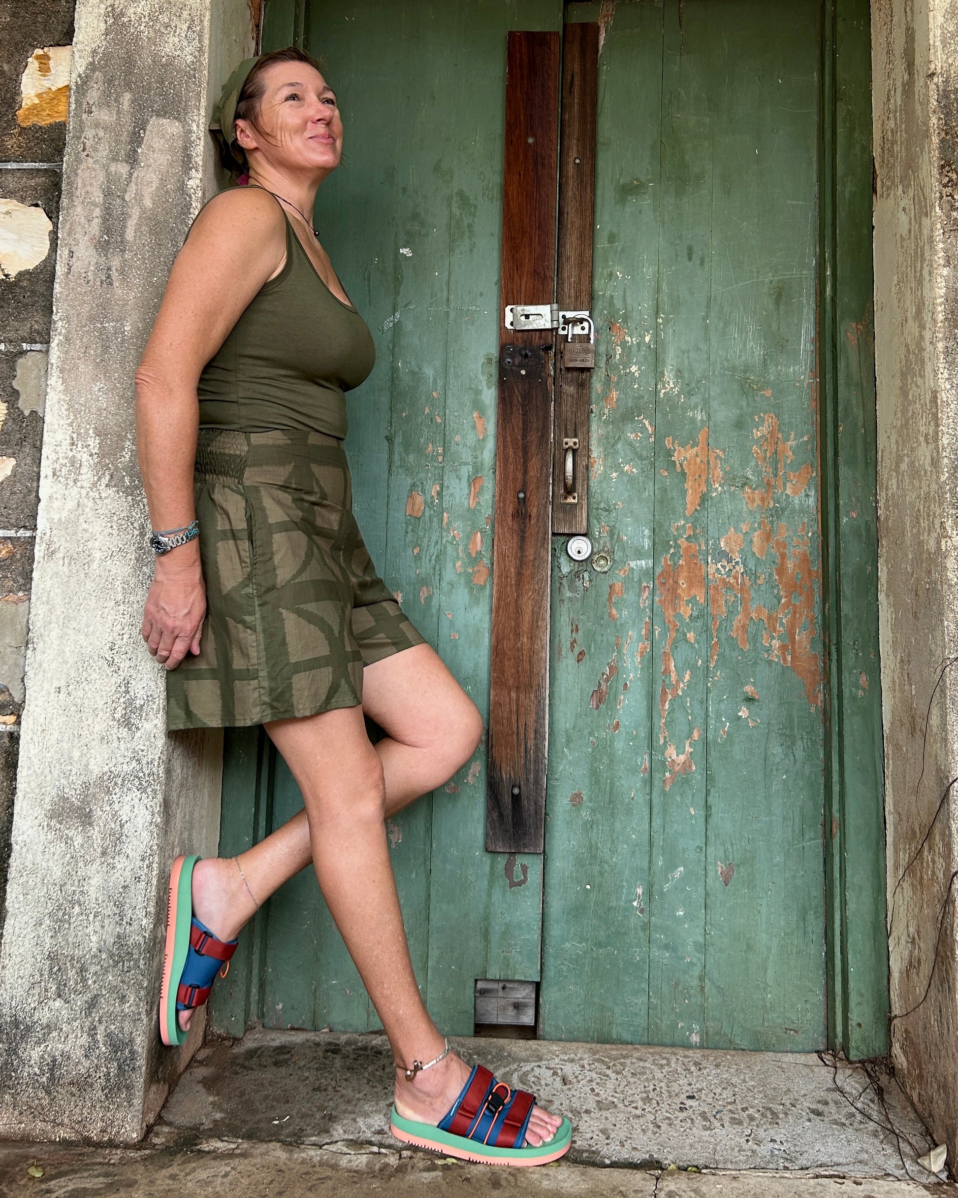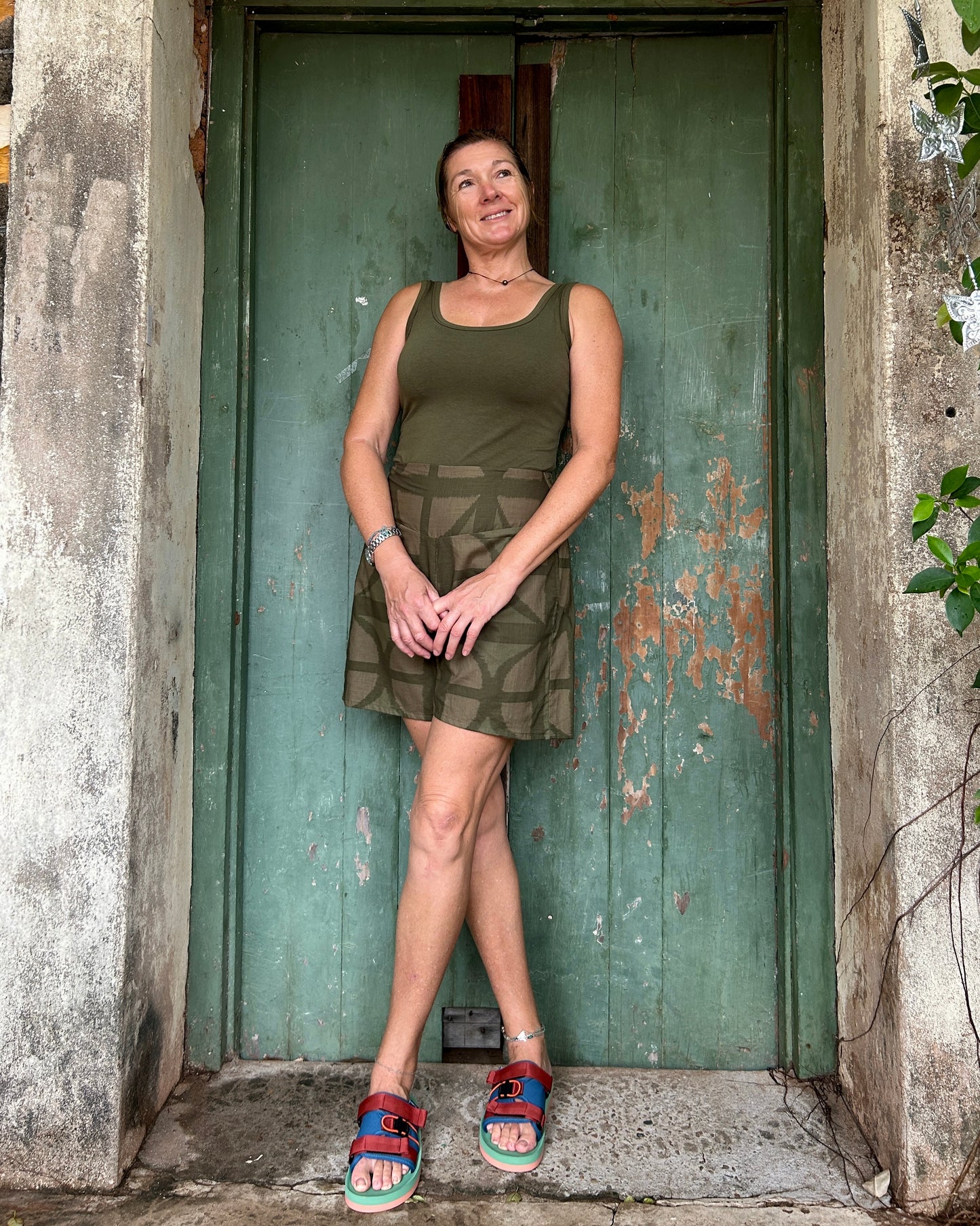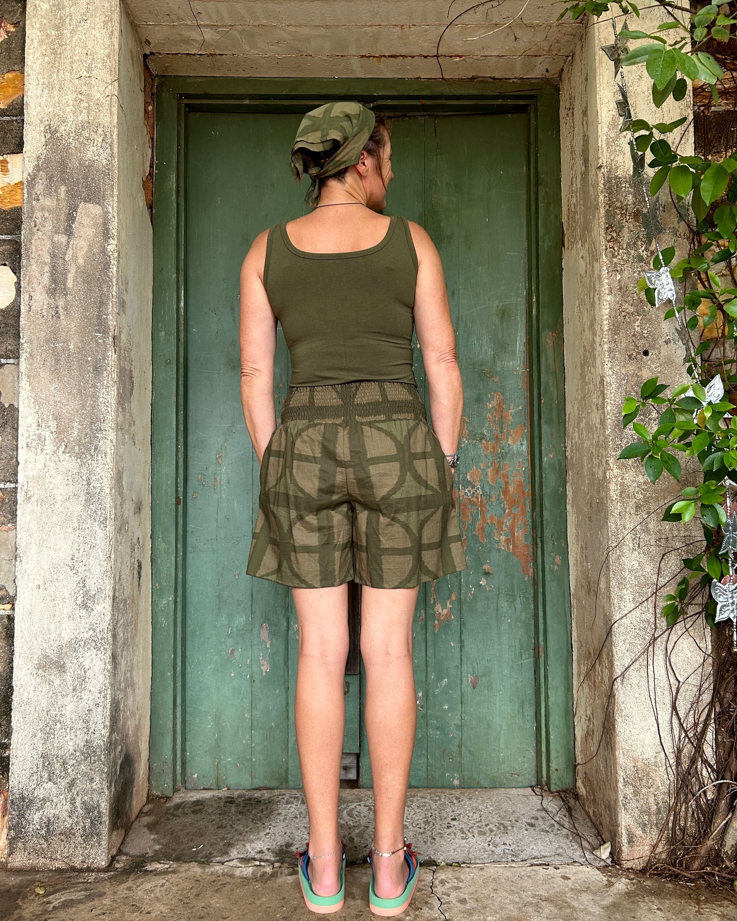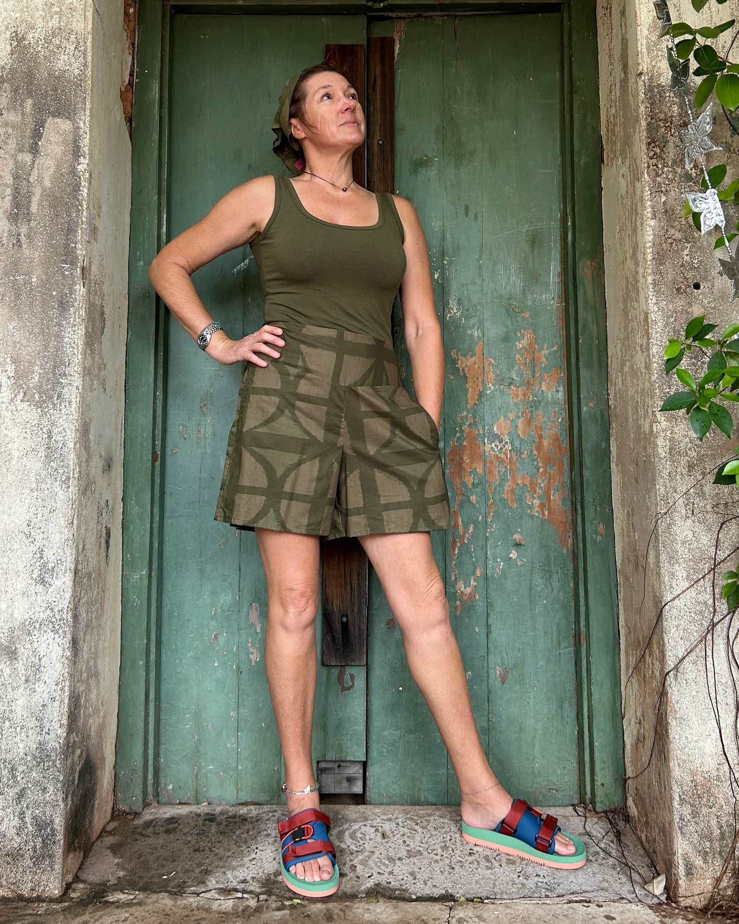 Our very own EXCLUSIVE screen-printed Breezeblock motif fabric in lightweight, cotton slub! In our delicious Urban Camo colour way!